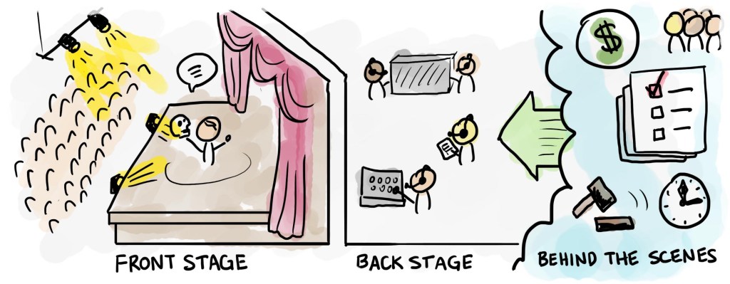 Theatre metaphors are fundamental to the principles of service design. The front stage is what customers see. Just like in theatre, backstage is what happens behind the scenes to enable the frontstage to happen. Backstage includes the policies, procedures and systems required to provide a good customer experience. The relationship between back stage and front stage is why service designers need to being able to understand the bigger picture and to think about systems, as discussed earlier. My understanding of theatre and systems thinking, both seem to be relevant here.