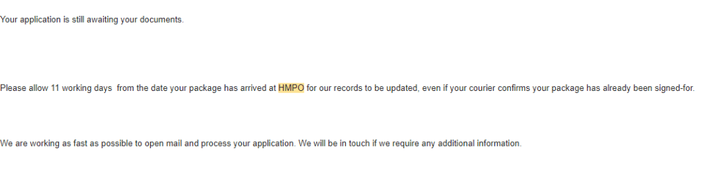 This is an email I received from HMPO (Her Majesties Passport Office) a few days after I had posted my PhD certificate. They state that they would be in touch if they require further information. They didn’t and instead simply withdrew my application as someone in one part of the system had not been informed that the information they were waiting for had already been received,